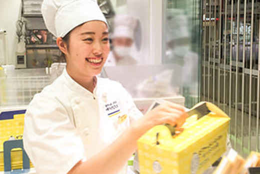 お菓子作りの専門的な知識や製造経験がなくても心配いりません。入社して最初の半年間は指導スタッフが横について、店舗業務を一つひとつ丁寧にレクチャーします。実務的なことを学ぶマンツーマン指導に加え、2ヶ月に1回は座学での研修もありますので、未経験の方もしっかり仕事を覚えることができますよ。