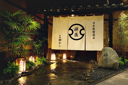瓦葺の屋根や大きな暖簾、バランス良く配置されたグリーンが、京料理屋を想わせる和食ダイニングレストラン。1920年代、台北郊外に建てられた“小師禅園十六茶舗”に影響を受けた店内は、どこか異国情緒漂う雰囲気を演出しています。