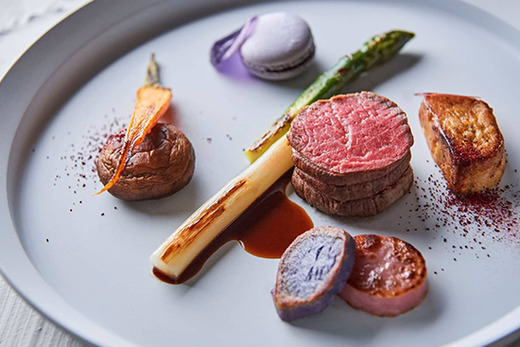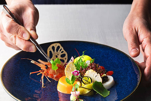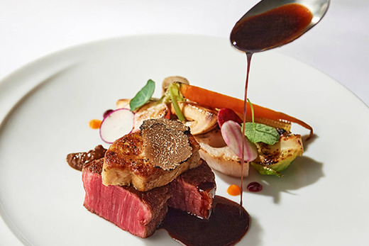 料理は幅広い年代のゲストに支持されるフレンチジャポネ。日本人が親しみやすい和のテイストを加えたフレンチを、世界に認められた腕利きシェフがご用意しています。また、パティシエのセンスと技がつまったデザートや、ウェディングケーキは上品な甘さと心を弾ませるデコレーションで、パーティーの締めくくりに感動と美味しさの余韻を残します。全ての披露宴会場にキッチンを併設しており、温かい料理は温かい内に、冷たい料理は冷たい内に、と熟練のサービススタッフが出来たての料理を一番おいしい状態でお客様の元へ運んでいます。