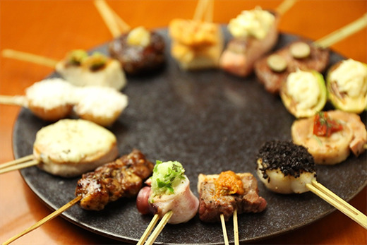 料理は鉄板を駆使して作られる串焼き全18種、定番メニューから変り種まで、オリジナリティ溢れるメニューを提供。